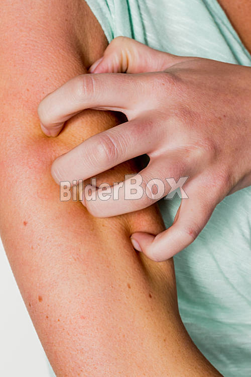 Beschreibung Eine Frau hat nach einem Mückenstich eine juckende Haut und kratzt sich