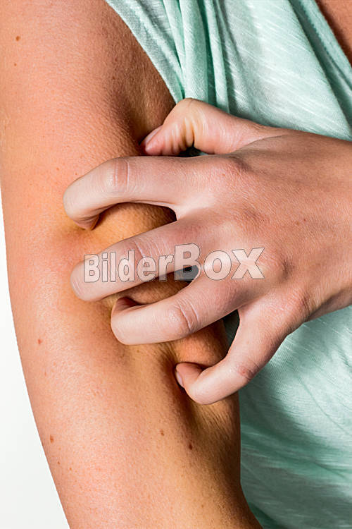 Beschreibung Eine Frau hat nach einem Mückenstich eine juckende Haut und kratzt sich