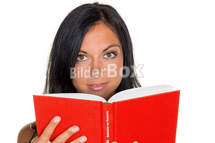 Beschreibung Eine junge Frau liest ein Buch mit einem roten Umschlag