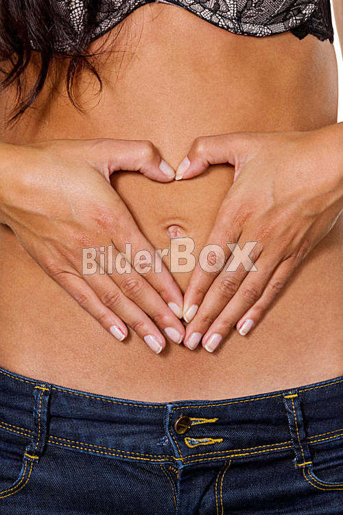 Beschreibung Eine junge Frau macht auf ihren Bauch ein Herz mit ihren Händen. Symbolfoto für Liebe