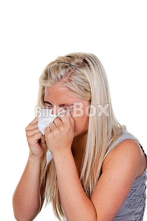 Beschreibung Frau mit Allergie, Heuschnupfen und Taschentuch