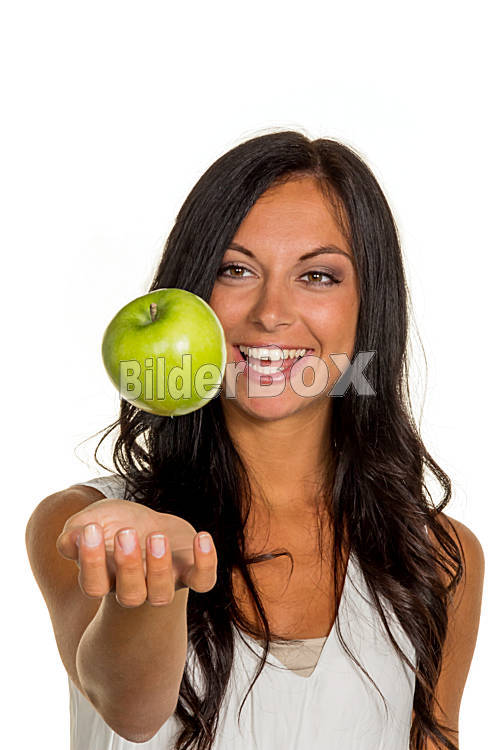 Beschreibung Eine junge Frau hält einen Apfel in der Hand. Obst und Gemüse für gesunde und vitaminreiche Ernährung