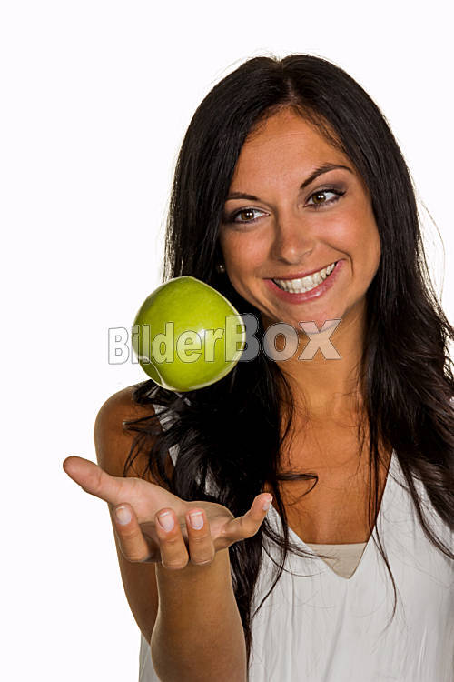 Beschreibung Eine junge Frau hält einen Apfel in der Hand. Obst und Gemüse für gesunde und vitaminreiche Ernährung