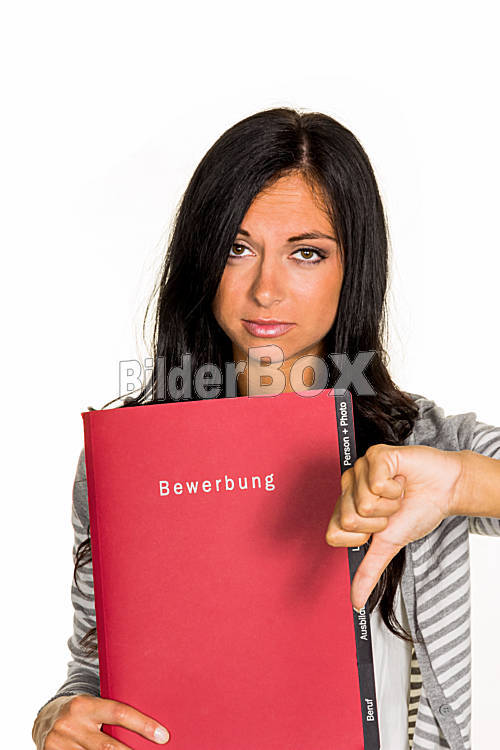 Beschreibung Eine junge Frau hält eine Mappe für die Bewerbung bei einer offenen Arbeitsstelle in der Hand.
