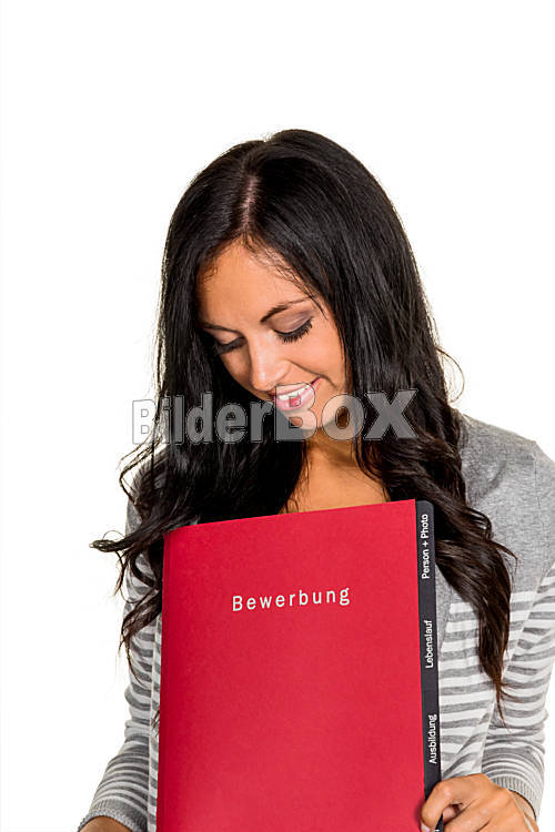 Beschreibung Eine junge Frau hält eine Mappe für die Bewerbung bei einer offenen Arbeitsstelle in der Hand.