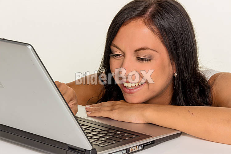 Beschreibung Eine junge Frau mit einem Laptop Computer. Symbol Foto für Kommunikation und moderne Medien.