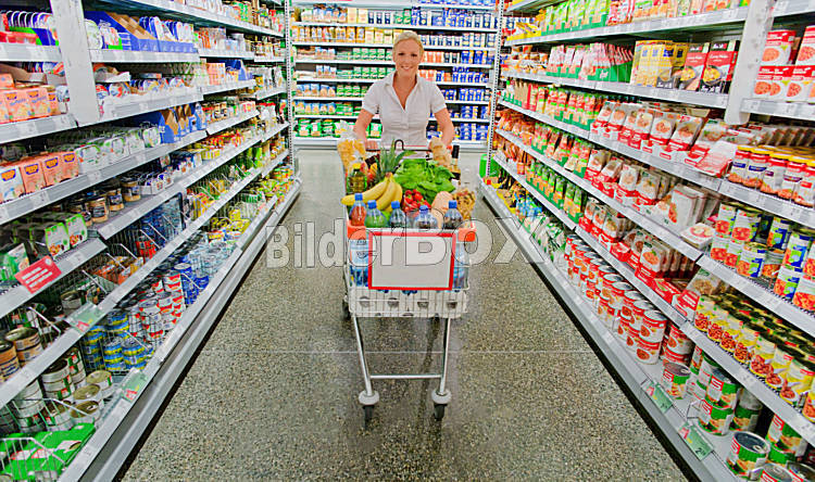 Frau mit Einkaufswagen im Supermarkt
