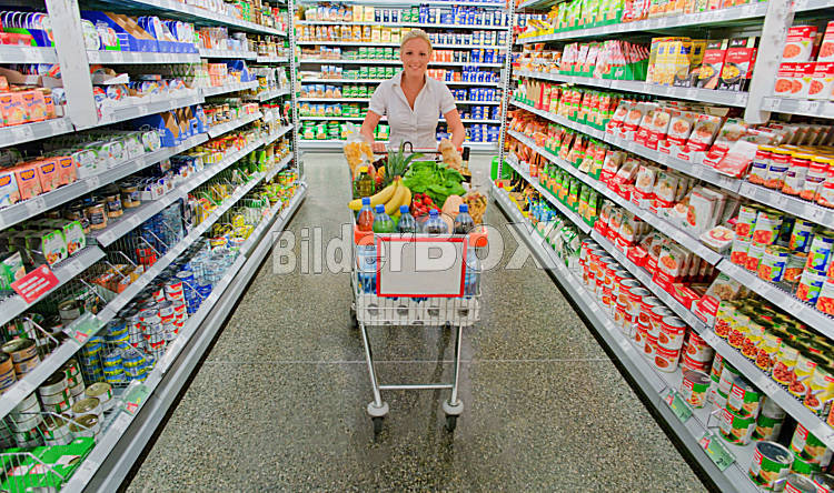 Beschreibung Eine Frau beim Einkauf von Lebensmittel in einem Supermarkt. Alltag einer Hausfrau