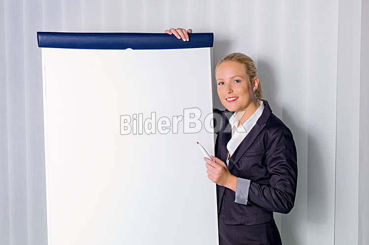 Beschreibung Eine junge Frau mit einer Flip-Chart Tafel bei einer Präsentation. Weiterbildung und Erwachsenenbildung.