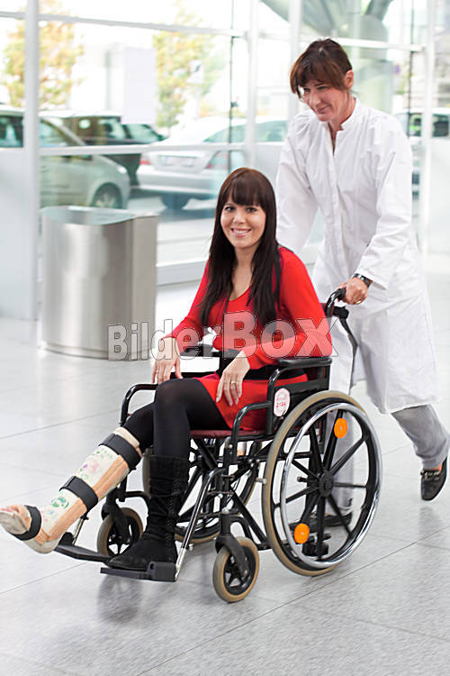 Beschreibung Junge Frau mit Gipsbein, Rollstuhl und Pflegerin