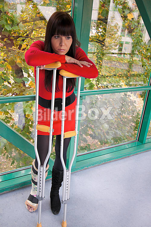 Frau mit Gipsbein und Krücken im Krankenhaus