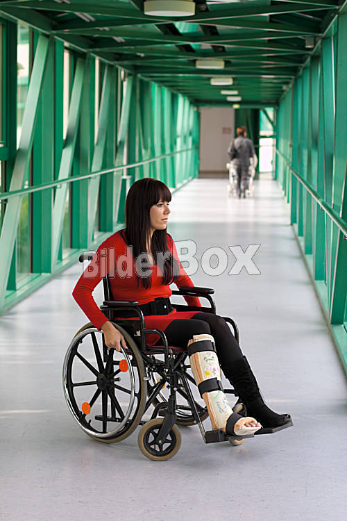 Beschreibung Junge Frau mit Gipsbein und Rollstuhl im Krankenhaus