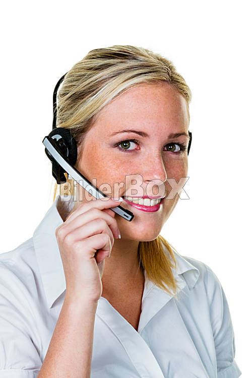Beschreibung Junge Frau mit Headset telefoniert im Büro bei Auftragsannahme. Hotline und Kundenservice.