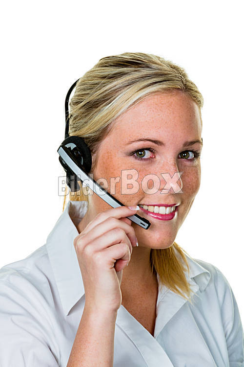 Beschreibung Junge Frau mit Headset telefoniert im Büro bei Auftragsannahme. Hotline und Kundenservice.