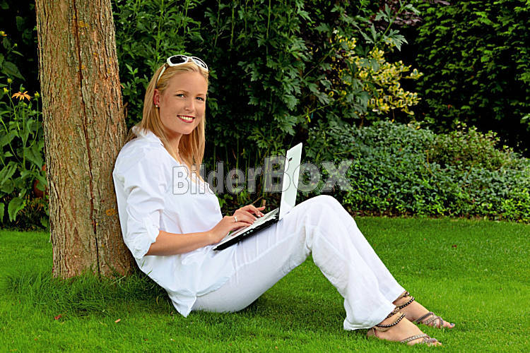 Beschreibung Eine junge Frau sitzt mit einem Laptop Computer im Garten und surft im Internet. WLAN im Park.