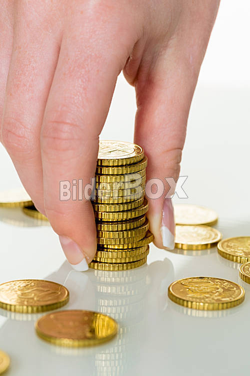 Beschreibung Eine Frau stapelt Münzen. Geld sparen für die Zukunft.