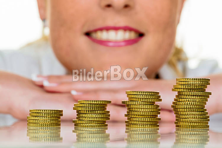 Beschreibung Eine Frau stapelt Münzen. Geld sparen für die Zukunft.