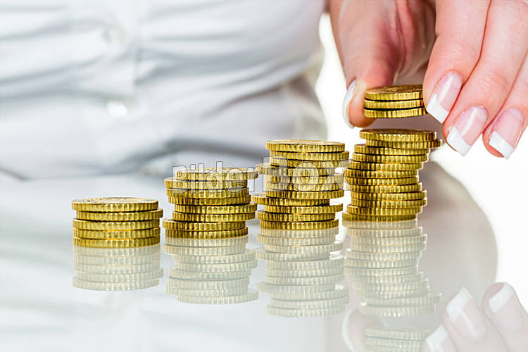 Beschreibung Eine Frau stapelt Münzen. Geld sparen für die Zukunft.