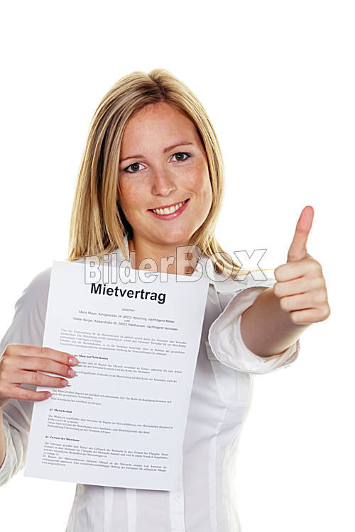 Beschreibung Eine junge Frau hat einen Mietvertrag erfolgreich abgeschlossen.