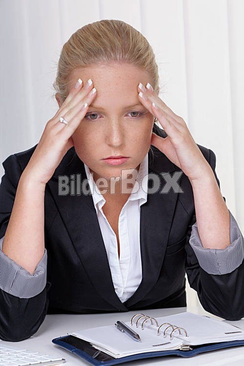 Beschreibung Eine junge Frau mit Migräne und Kopfschmerzen sitzt in einem Büro.
