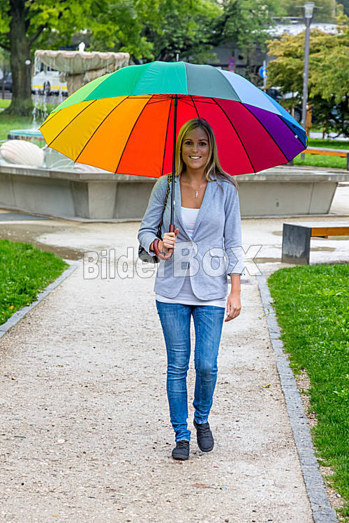 Beschreibung Eine junge Frau geht mit einem bunten Regenschirm in der Hand im Regen spazieren.
