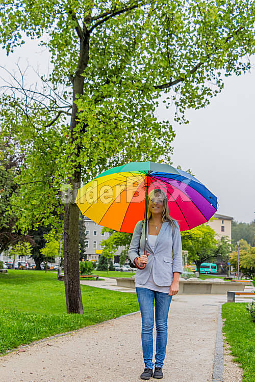 Beschreibung Eine junge Frau geht mit einem bunten Regenschirm in der Hand im Regen spazieren.