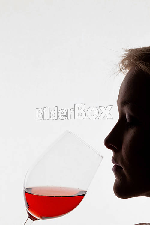 Beschreibung Eine junge Frau bei einer Weinverkostung. Probiert ein Glas Rotwein im Rotweinglas