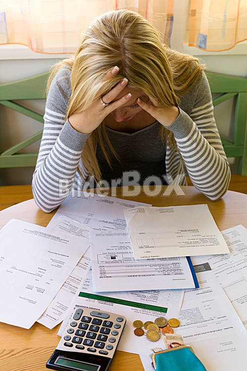 Beschreibung Eine Frau mit offenen Rechnungen hat viele Schulden. Arbeitslosigkeit und Privatkonkurs