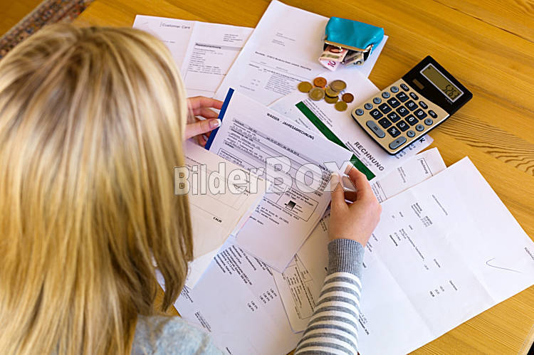 Beschreibung Eine Frau mit offenen Rechnungen hat viele Schulden. Arbeitslosigkeit und Privatkonkurs