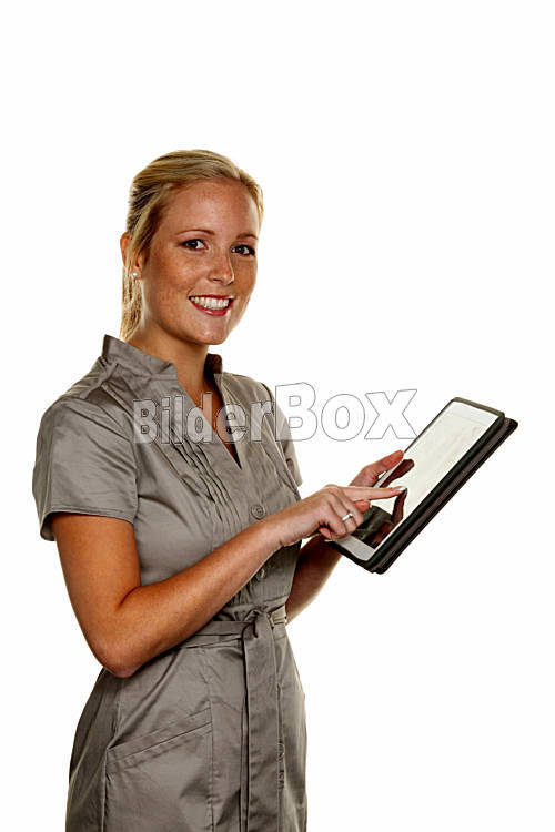 Beschreibung Eine junge Frau mit ihrem Tablet Computer vor weißem Hintergrund