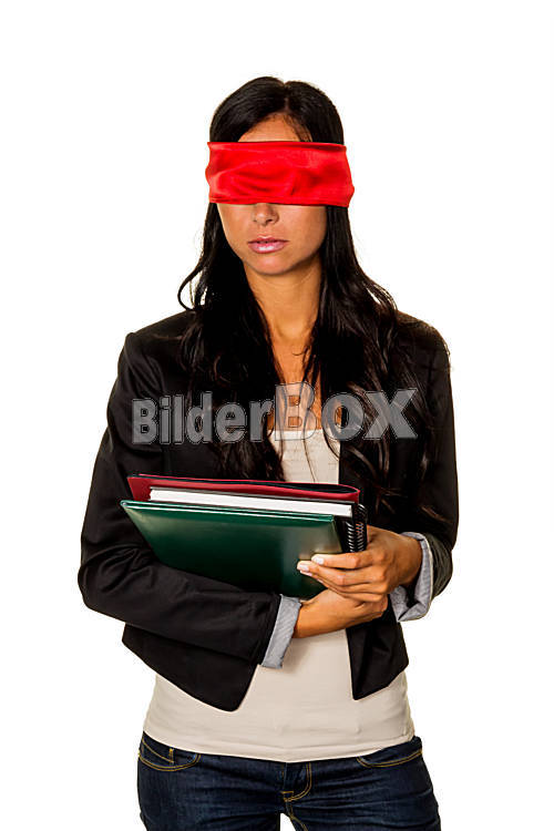 Beschreibung Eine junge Frau mit verbundenen Augen.
