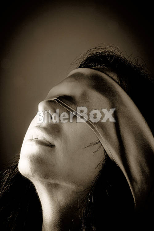 Beschreibung Eine junge Frau mit verbundenen Augen. Symbol für Erotik, Hilflosigkeit, Gefangenschaft
