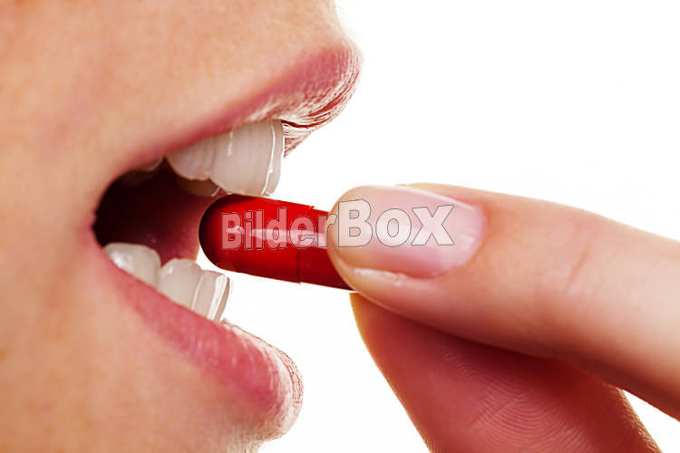Beschreibung Eine Frau nimmt die Kapsel einer Tablette ein. Medizinische Versorgungsmedikamente