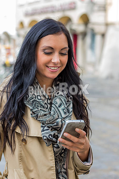 Beschreibung Eine junge Frau schreibt auf seinem Handy ein SMS. Kommunikation mit einem Smart phone