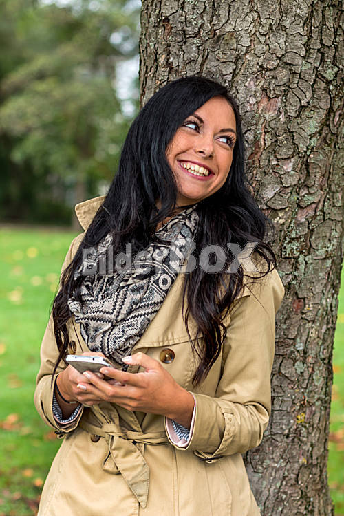 Beschreibung Eine junge Frau schreibt auf seinem Handy ein SMS. Kommunikation mit einem Smart phone