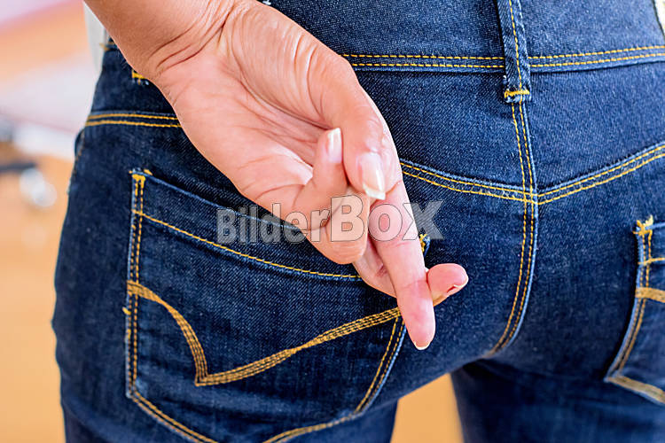 Beschreibung Eine Frau hält hinter ihrem Rücken die Finger überkreuzt. Sie schwört einen Meineid