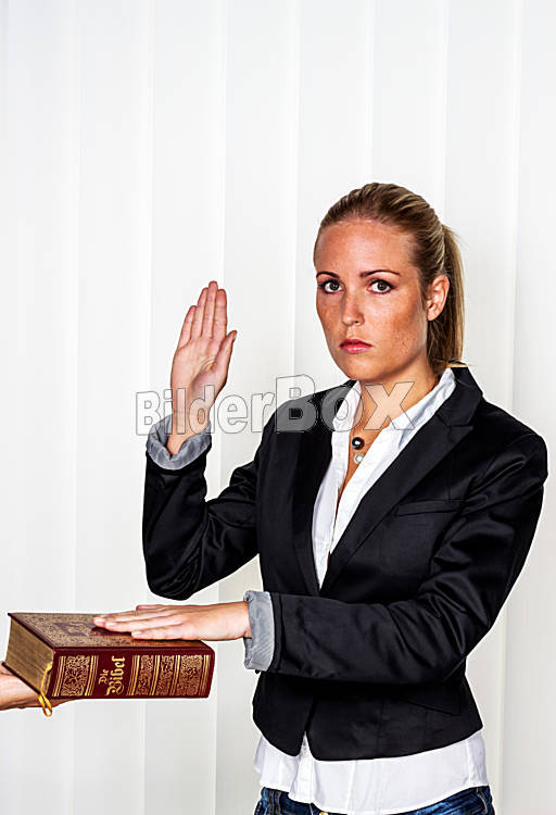 Beschreibung Eine Frau sagt als Zeuge bei Gericht in einem Gerichtsverfahren aus. Wird vereidigt und schwört auf die Bibel.