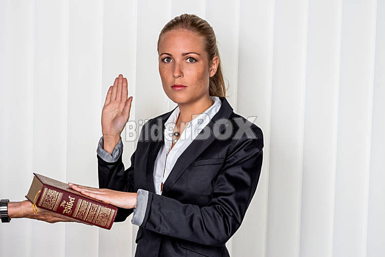 Beschreibung Eine Frau sagt als Zeuge bei Gericht in einem Gerichtsverfahren aus. Wird vereidigt und schwört auf die Bibel.