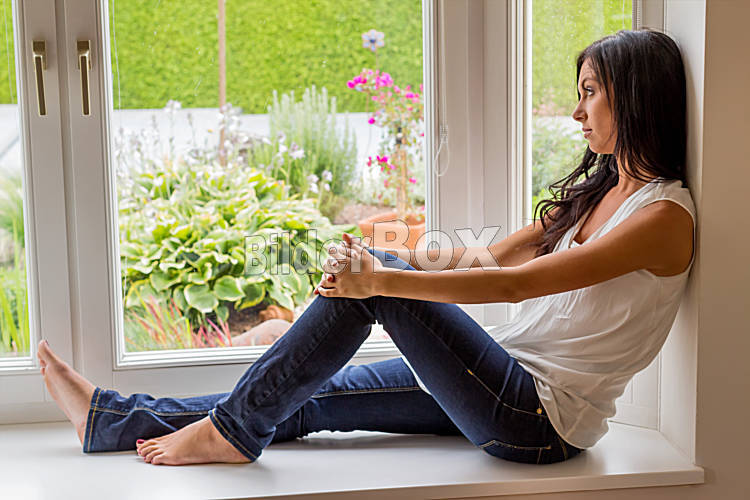 Beschreibung Eine junge Frau sitzt am Fenster und entspannt sich