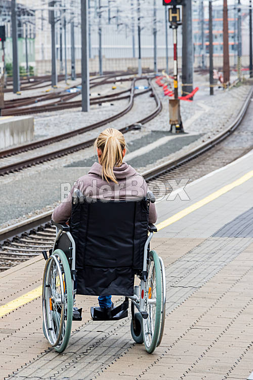 Beschreibung Eine junge Frau sitzt in einem Rollstuhl auf einem Bahnhof