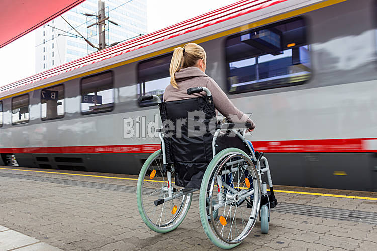 Beschreibung Eine junge Frau sitzt in einem Rollstuhl auf einem Bahnhof
