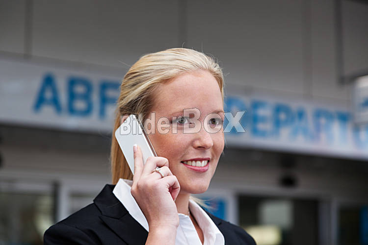 Beschreibung Eine Geschäftsfrau telefoniert mit ihrem Handy am Flughafen. Roaminggebürhen bei Smartphones im Ausland