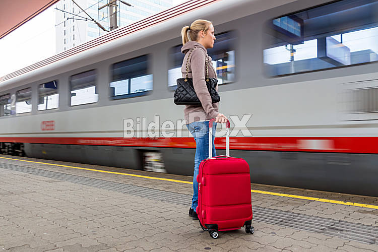 Beschreibung Eine junge Frau wartet auf einen Zug in einem Bahnhof. Zugfahrt in den Urlaub