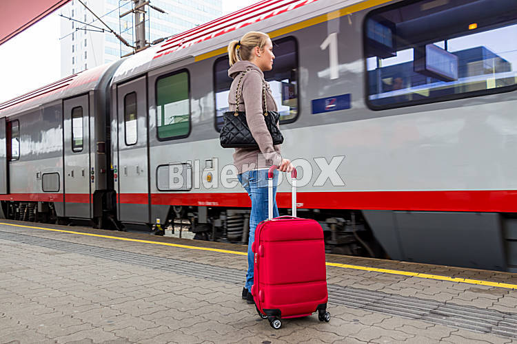 Beschreibung Eine junge Frau wartet auf einen Zug in einem Bahnhof. Zugfahrt in den Urlaub