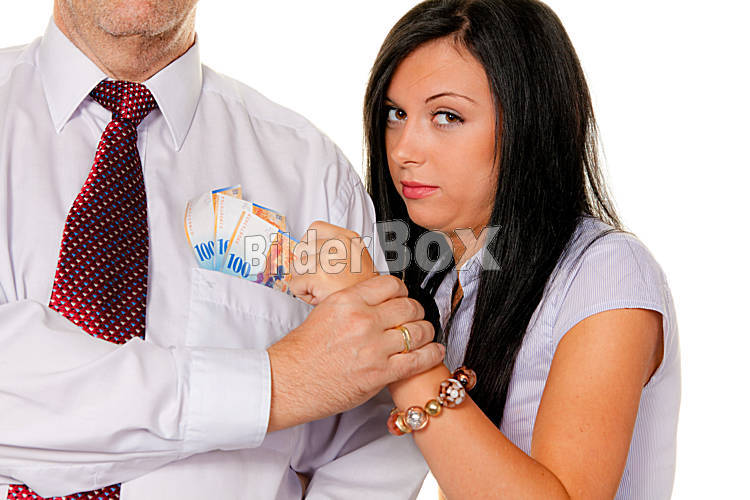 Beschreibung Junge Frau zieht einem Mann Schweizer Franken aus der Tasche
