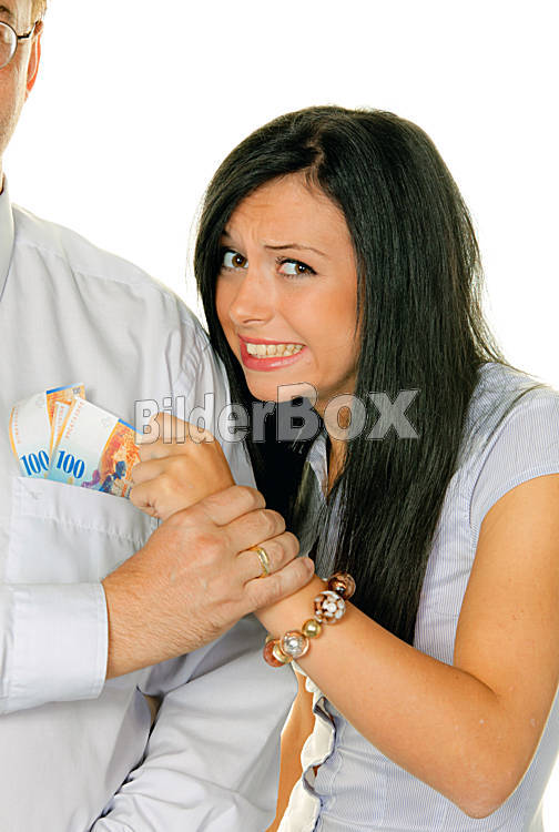 Beschreibung Junge Frau zieht einem Mann Schweizer Franken aus der Tasche