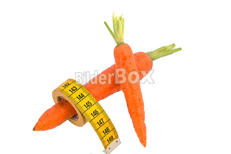 Beschreibung Möhren aus biologischem Anbau mit Massband. Frisches Obst und Gemüse ist immer gesund. Symbolfoto für gesunde Diät.
