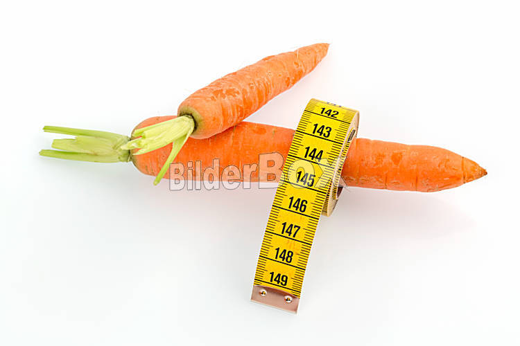 Beschreibung Möhren aus biologischem Anbau mit Massband. Frisches Obst und Gemüse ist immer gesund. Symbolfoto für gesunde Diät.
