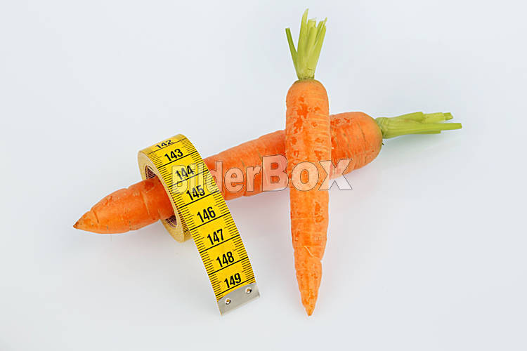 Beschreibung Möhren aus biologischem Anbau mit Massband. Frisches Obst und Gemüse ist immer gesund. Symbolfoto für gesunde Diät.