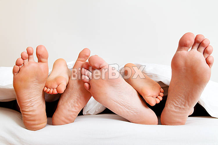 Beschreibung Die Fußsohlen einer Familie im Bett unter der Decke.